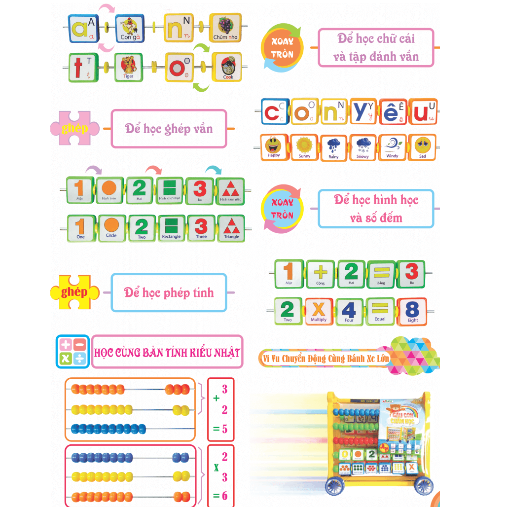 - Bé học tính nhanh với các hạt tính bằng cách gạt các hạt tính dễ thương. Với cách học thú vị này chắc chắn bé sẽ thích mê và học văn- toán rất giỏi.