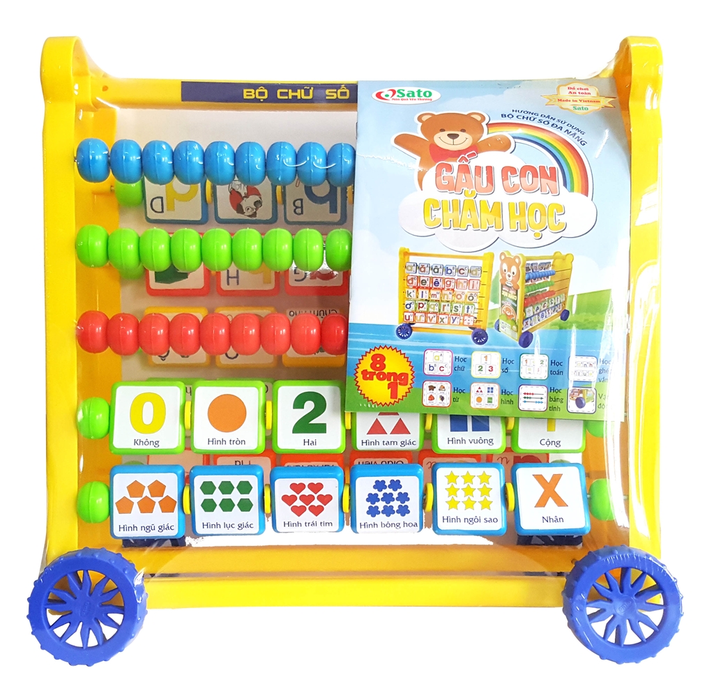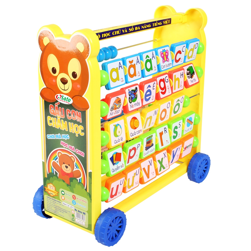 - Bộ học chữ và số Tiếng Việt Sato - Gấu con chăm học được làm từ chất liệu nhựa nguyên sinh ABS an toàn cho bé, vì vậy bố mẹ không phải lo lắng mỗi khi bé tiếp xúc với đồ chơi