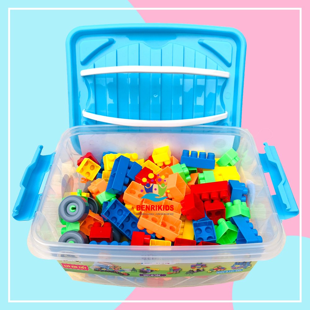 - Đồ chơi xếp hình 125 chi tiết làm bằng nhựa nguyên sinh với các miếng ghép to nên bố mẹ hoàn toàn yên tâm cho bé chơi, không sợ con ngậm, nuốt các chi tiết.